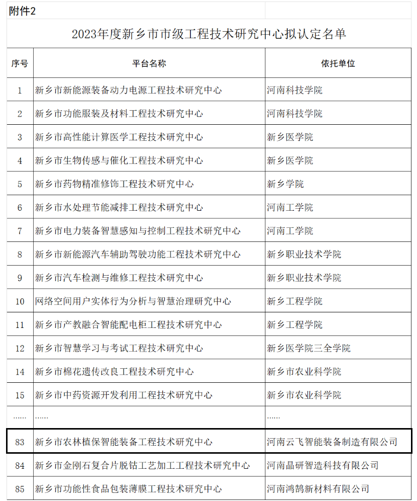 9月1日,新鄉(xiāng)市科學(xué)技術(shù)局公示了2023年度新鄉(xiāng)市市級工程技術(shù)研究中心擬認(rèn)定名單,云飛科技全資子公司河南云飛智能裝備制造有限公司成功入選,批準(zhǔn)建設(shè)新鄉(xiāng)市農(nóng)林植保智能裝備工程技術(shù)研究中心。